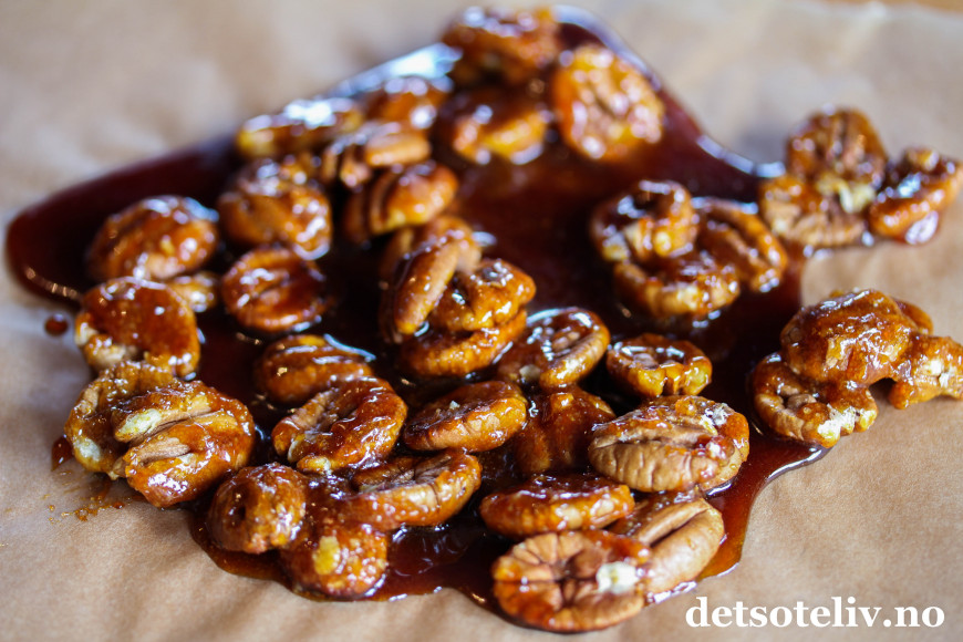 Smelt sukkeret i en teflonbelagt stekepanne til det blir lysebrunt og flytende (pass deg så du ikke brenner deg, for smeltet sukker er veldig varmt!). Ta stekepannen fra platen og bland i pekannøtter. Rør raskt rundt så pekannøttene blir mest mulig dekket av det smeltede sukkeret. Ha de karamelliserte pekannøttene straks over på bakepapiret. Bruk to gafler og skill nøttene litt fra hverandre. Vær rask, for det smeltede sukkeret stivner fort.