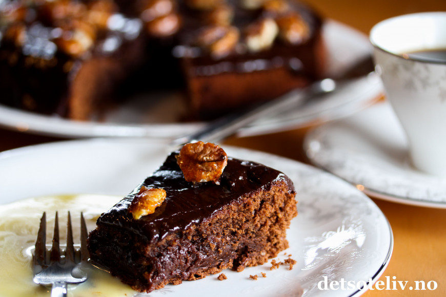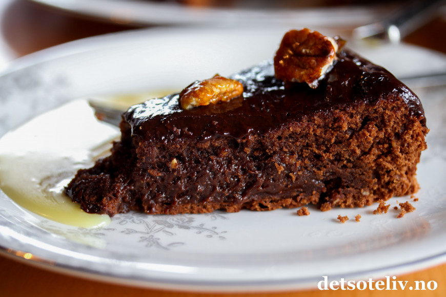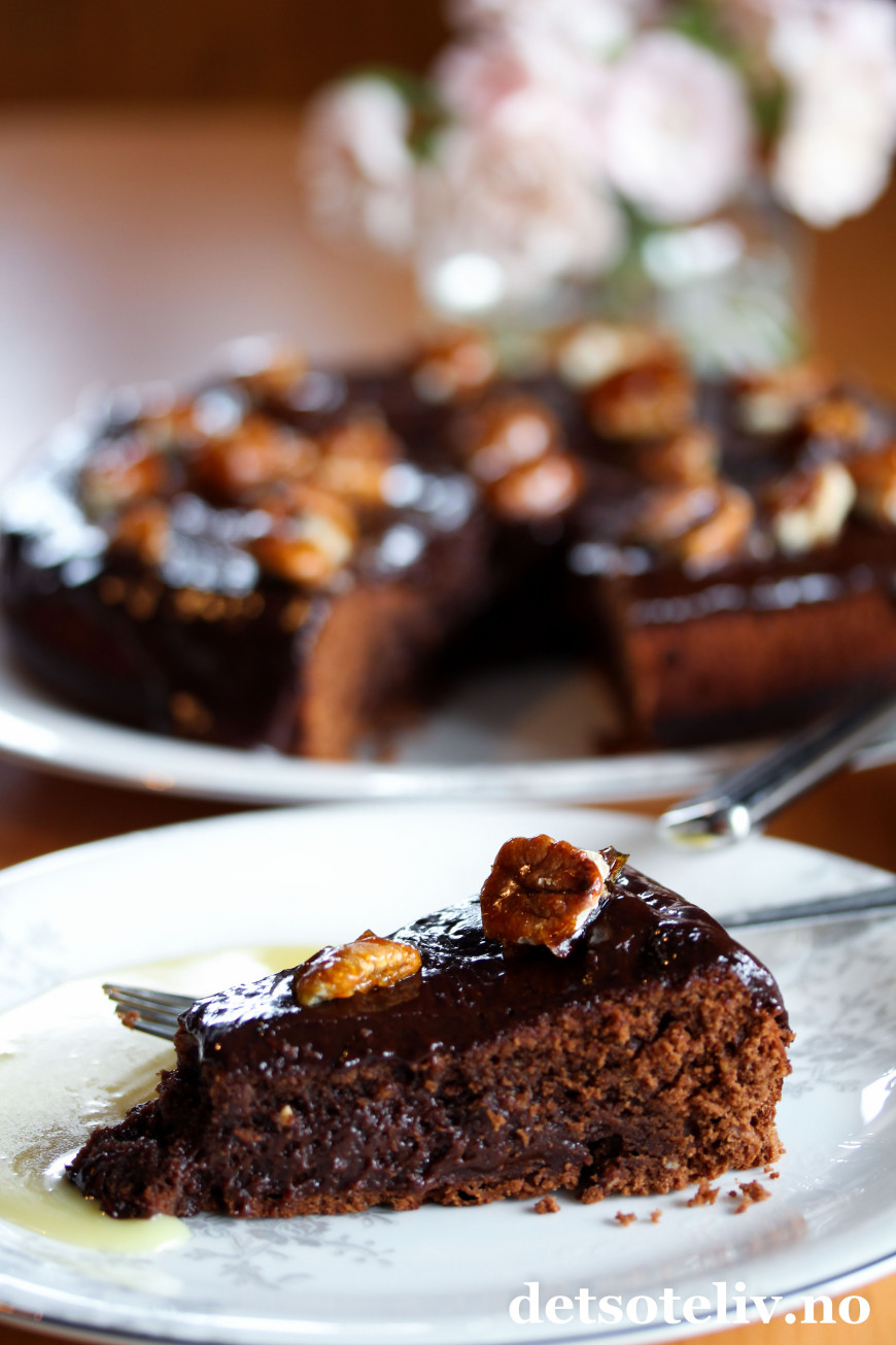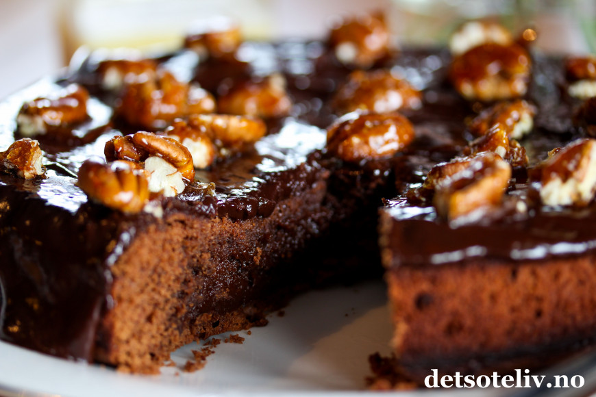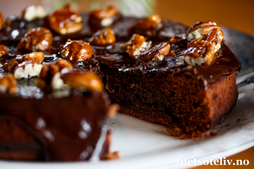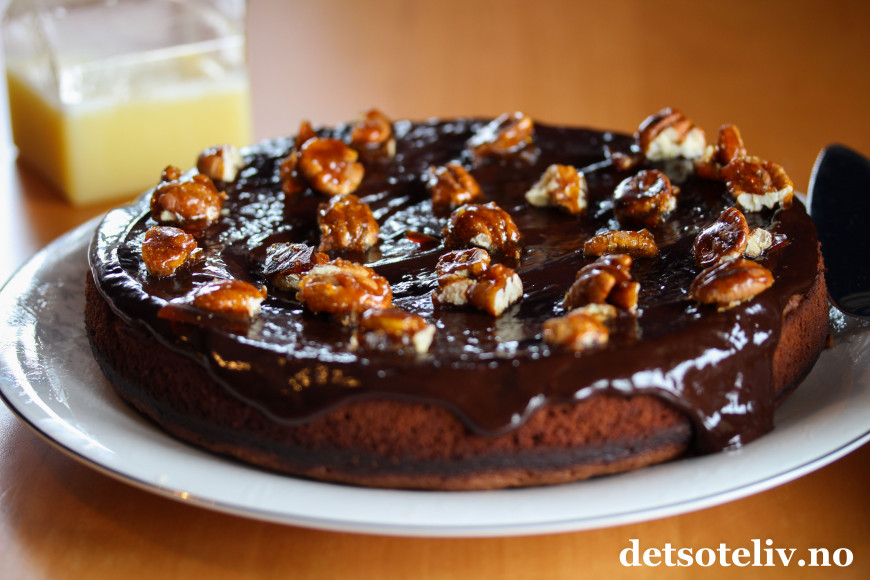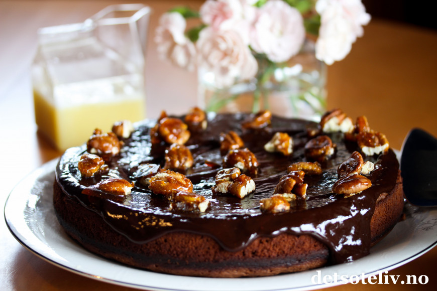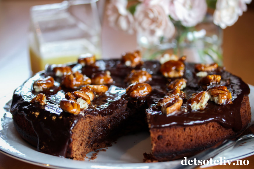 Jeg pyntet kaken med karamelliserte pekannøtter og serverte hjemmelaget hvit sjokoladesaus ved siden av.