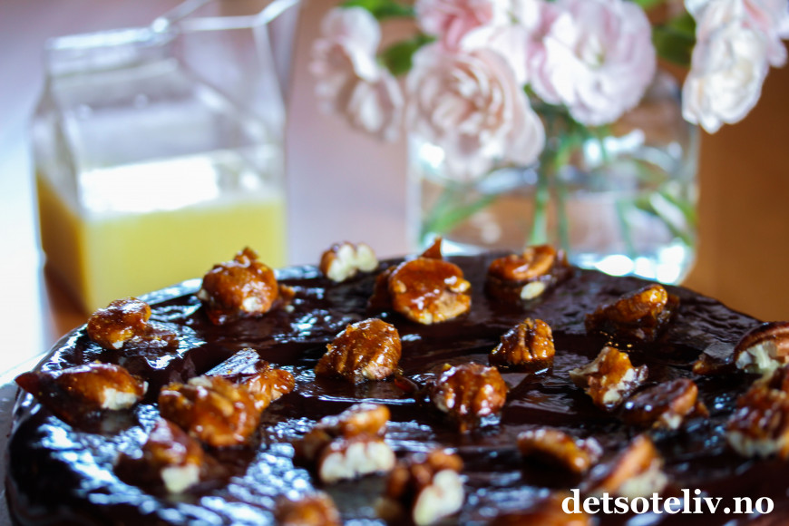 Pynt med karamelliserte pekannøtter og sett kaken i kjøleskapet.