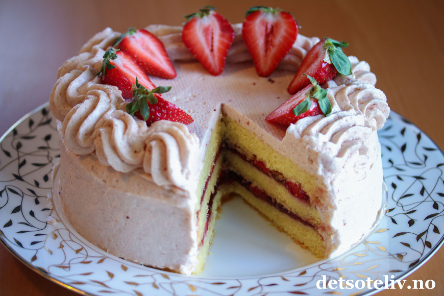 ♥ Det går fint å lage denne klar dagen før den skal serveres. Oppbevar den i kjøleskapet, men ta den gjerne ut av kjøleskape 30 minutter før servering, så jordbærsmørkremen blir myk og kremete. Pynt helst med friske jordbær på serveringsdagen så jordbærene ser helt ferske ut.