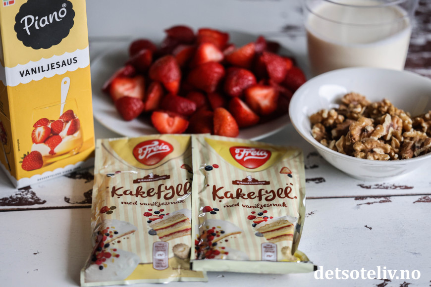 Ideen kom en 17. mai jeg skulle lage en bløtkake som jeg ville fylle med vaniljekrem, og så fant ut at jeg hadde glemt å kjøpe melk. Jeg pisket i stedet vaniljepulveret med vaniljesaus, og det ga faktisk en helt fantastisk vaniljekrem! I tillegg fylte jeg kaken med jordbær og valnøtter, som smaker nydelig sammen med vaniljekremen. Kaken ble laget i full fart, men ble likevel en kjempesuksess!