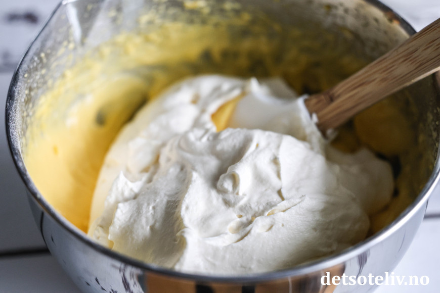 Pisk kremfløten til krem og vend i vaniljekremen, så vaniljekremen blir luftigere.