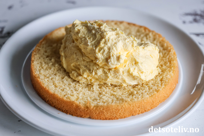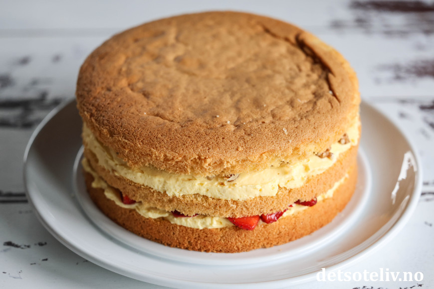 Det andre laget fyller du med vaniljekrem og hakkede valnøtter.