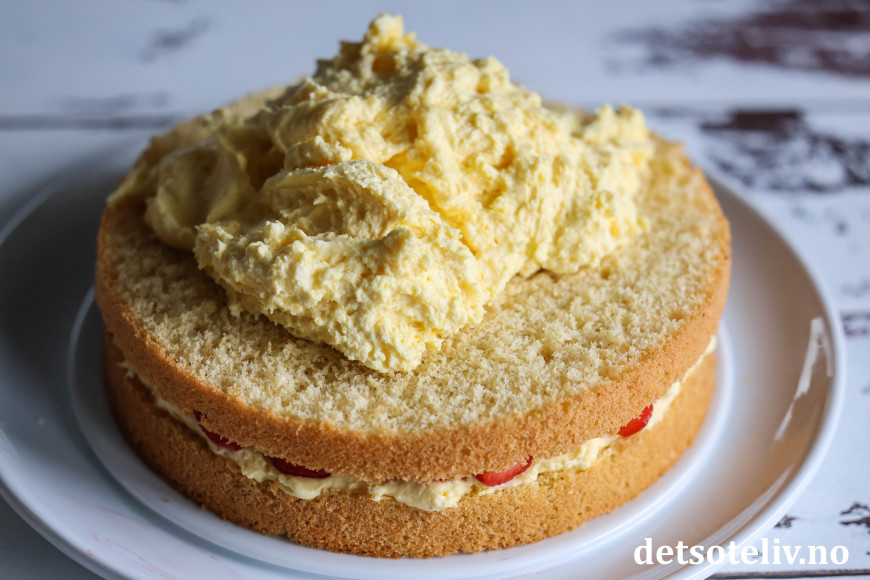 Fyll det første kakelaget med vaniljekrem og jordbærskiver.