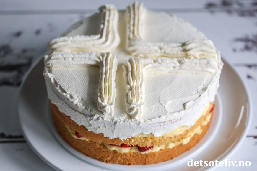 Pisk resten av kremfløten med melis. Pynt kaken med kremen og flaggstrøssel i rødt, hvitt og blått.