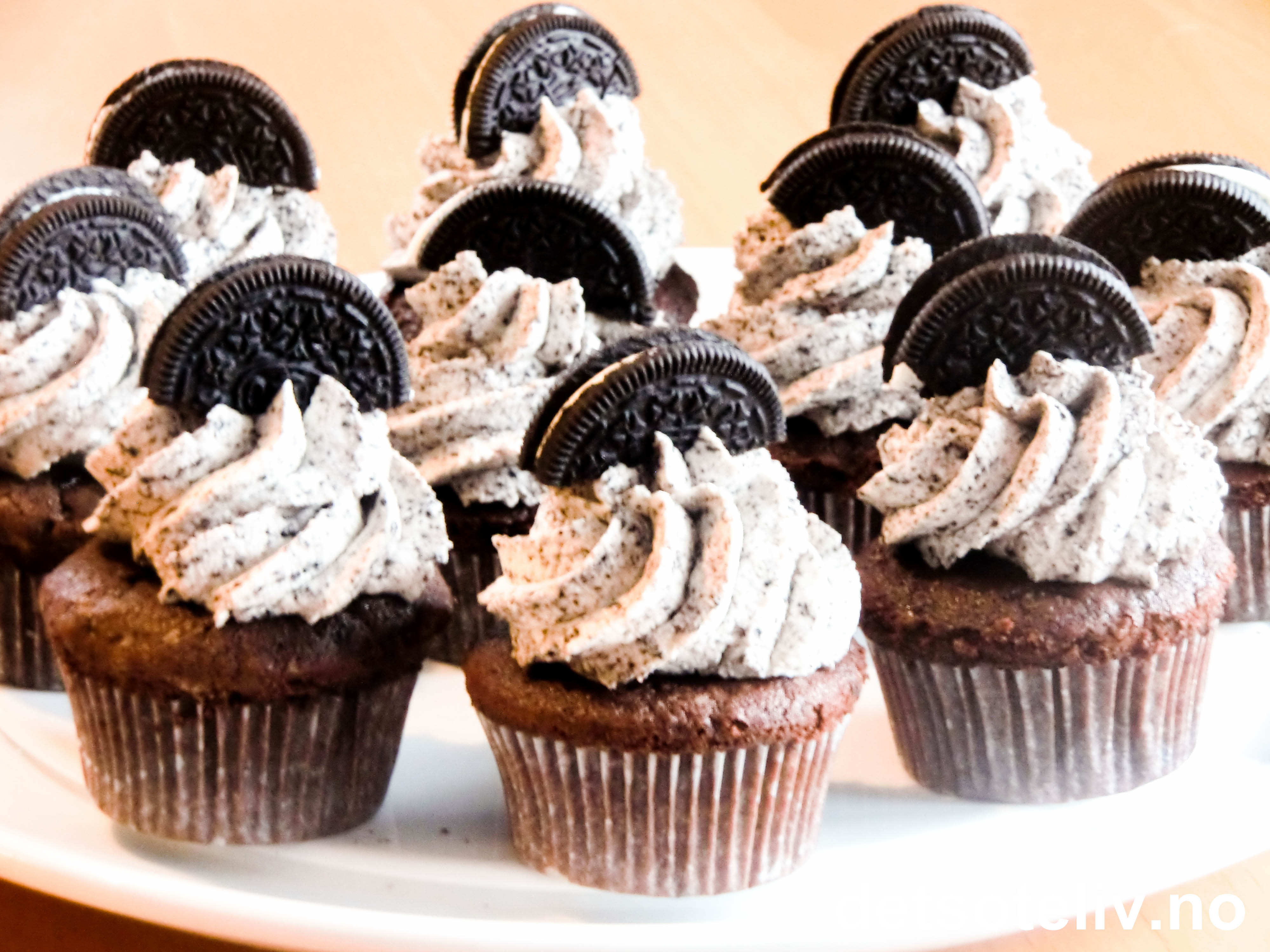 Dette er myke sjokoladecupcakes som kan bakes dagen i forveien og oppbevares godt innpakket i plast. De bør pyntes med Oreokrem samme dag de serveres så kremen er helt fersk.