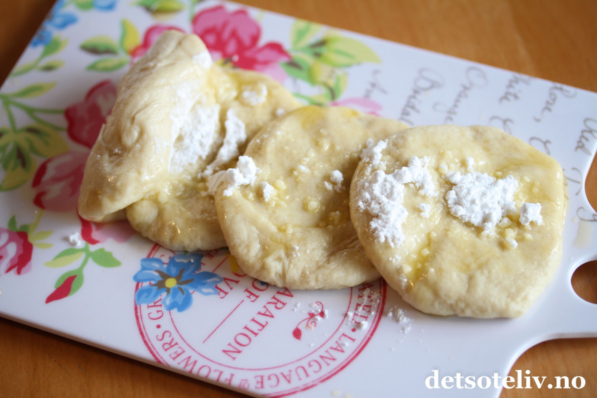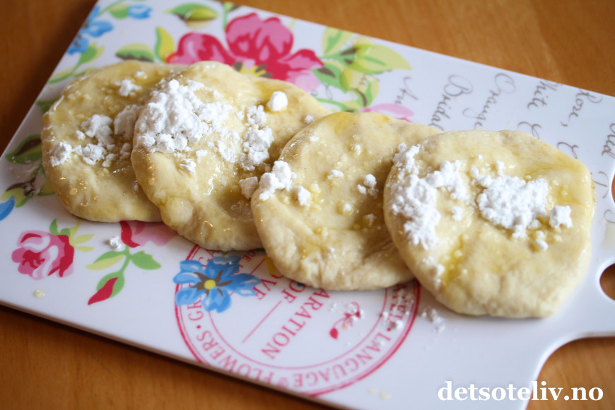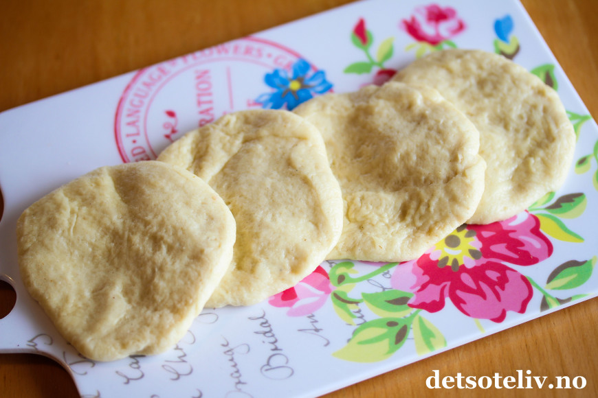 Trill hver bit til en kule og trykk disse flate mellom hendene.