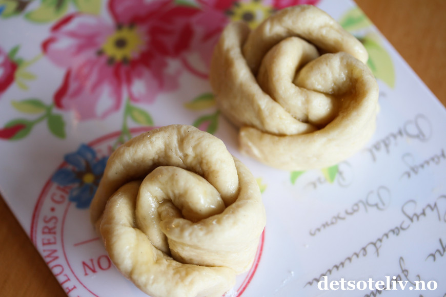 ♥ Det lønner seg å steke rosebollene i muffinsformer og eventuelt sette disse i muffinsbrett for at bollene skal holde fasongen bedre under stekingen. Bollene du ser på bildene i dette innlegget stekte jeg i muffinsformer, men jeg satte dem ikke i muffinsbrett.