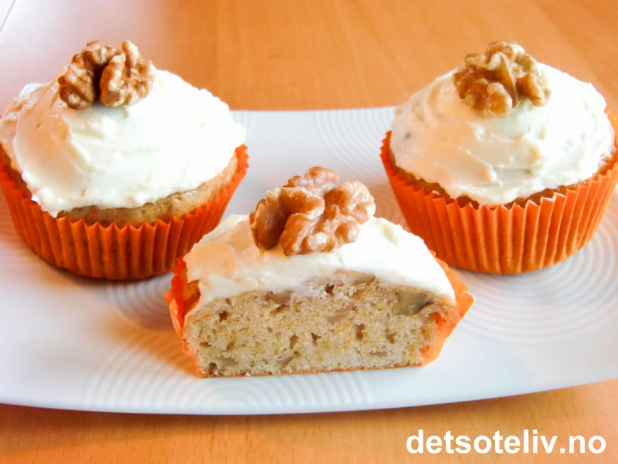 KJEMPEGODE, høstlige muffins som lages med revet gresskar, krydder, hakkede valnøtter og ostekrem! Oppskriften gir 12 stk.