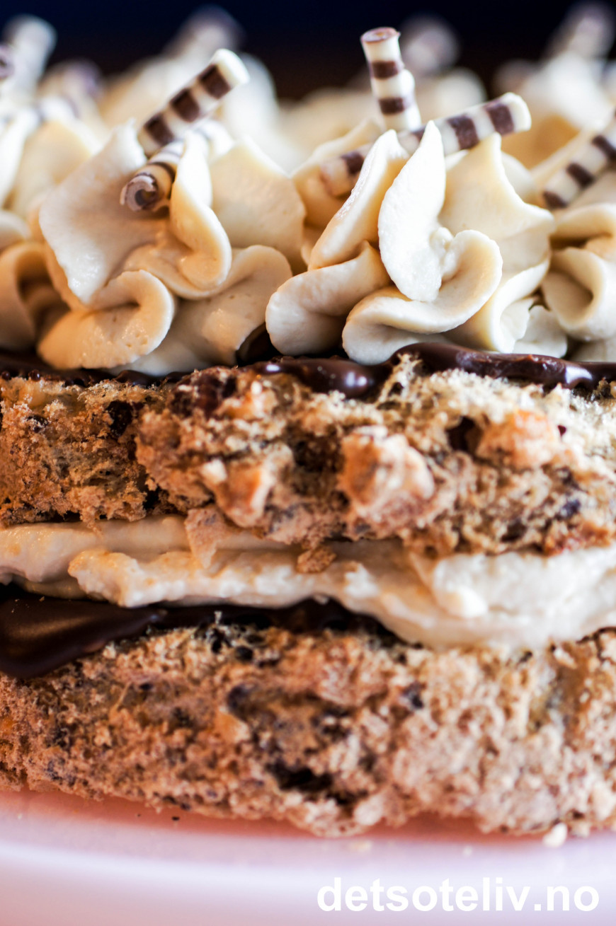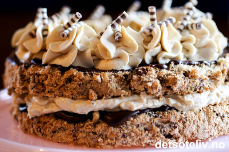 Kaken oppbevares i kjøleskapet frem til servering. Den er også kjempegod dagen etter!