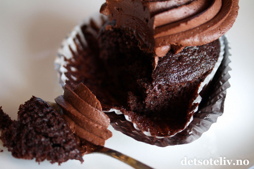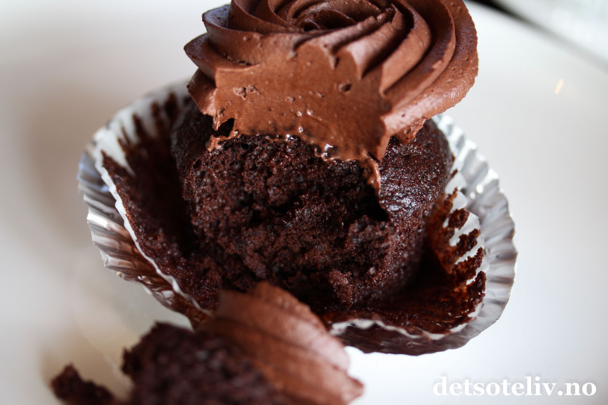 Konsistensen på muffinsene er utrolig myk og den luftige sjokoladekremen lages med fløtekrem og mascarpone. Det gjør at sjokoladekremen blir mye luftigere enn en tradisjonell sjokoladesmørkrem.