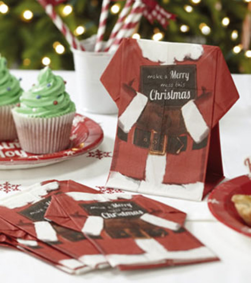Sammen med nisseluene får du også en pakke koselige, vintage juleservietter formet som en julenissedrakt og med teksten "Make a Merry Mess this Christmas".