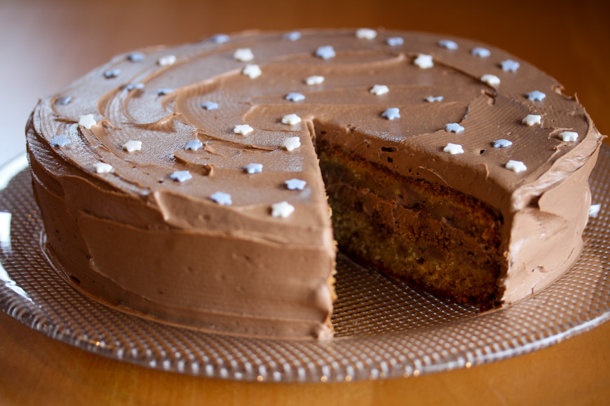 Stek kaken midt i ovnen ved 175°C i ca 40 min (sjekk med kakenål at kaken er gjennomstekt).