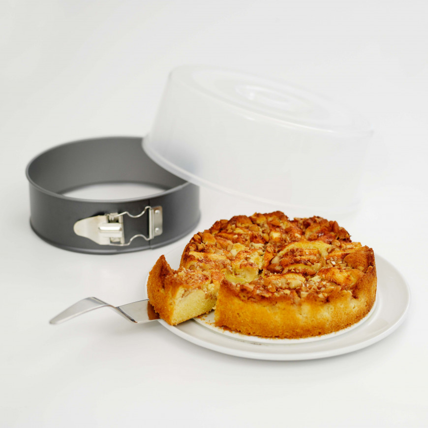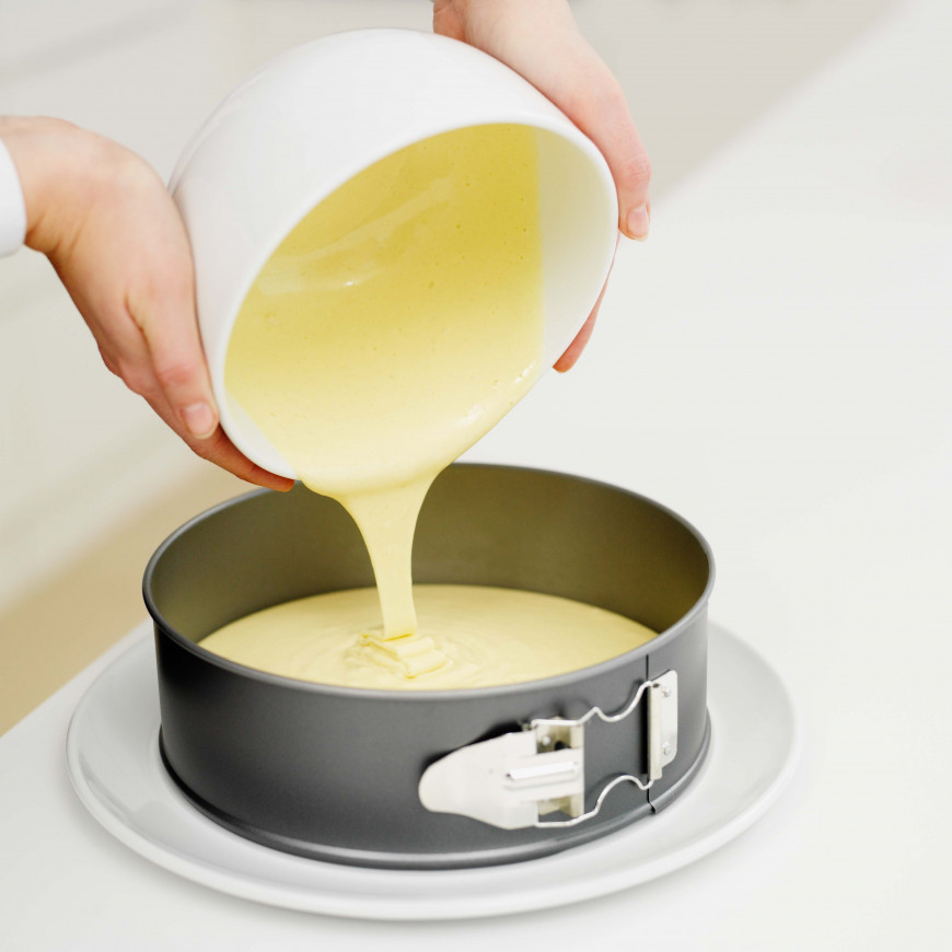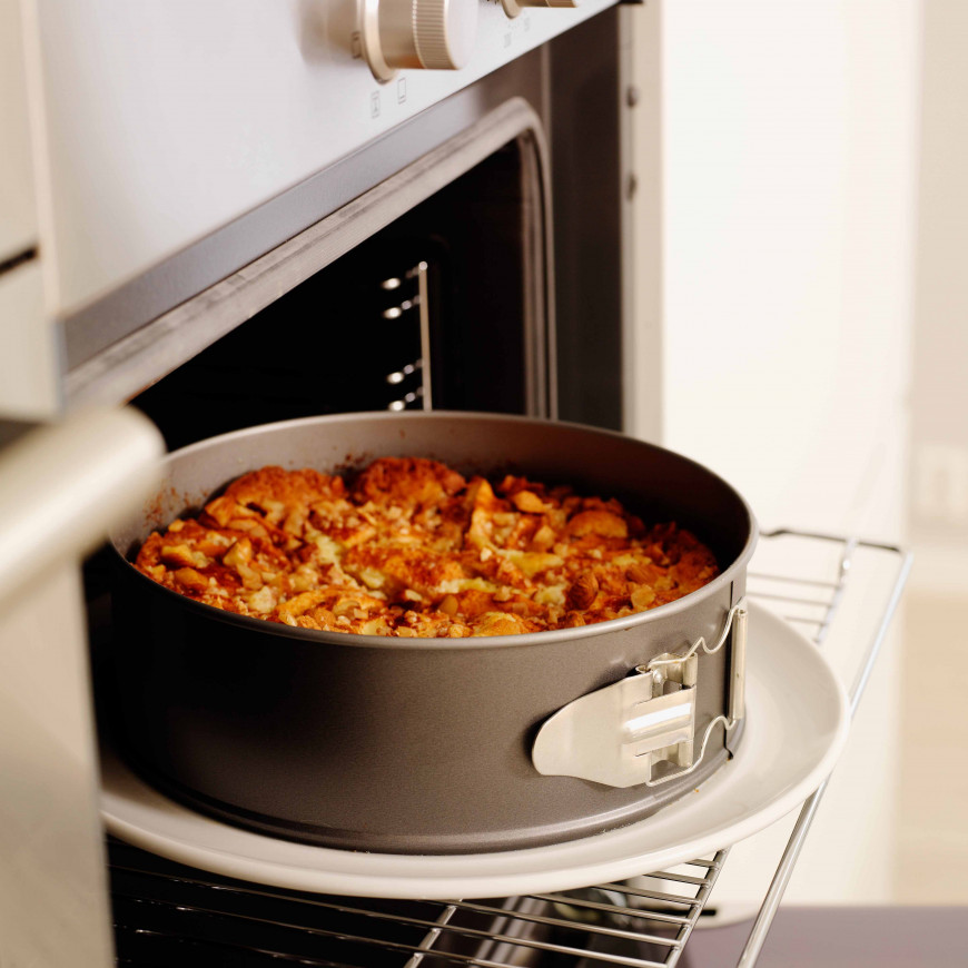 Når kaken er ferdig stekt, er det bare å løsne kakeringen, og så kan kaken serveres direkte fra kakefatet.
