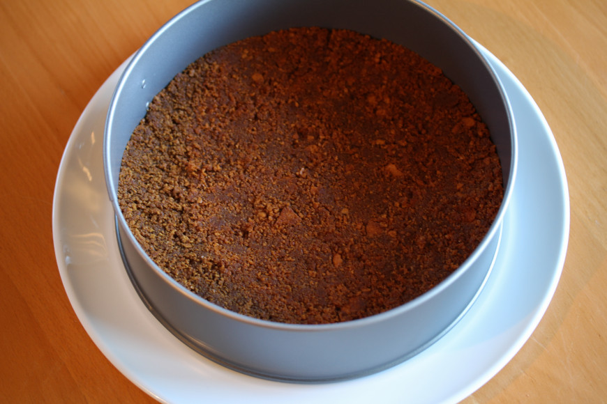 Knus pepperkakene og bland smulene med smeltet smør. Trykk pepperkakeblandingen ut i bunnen av en Bake it Easy-form.