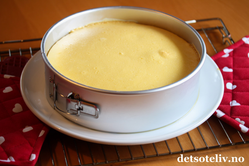 ♥ Det er lurt å steke kaken på stekeplate og ikke på rist, for noe av smøret i kakebunnen kan renne ut av formen under stekingen, og da slipper du å få fettet i bunnen av ovnen.