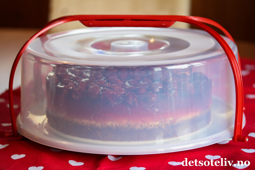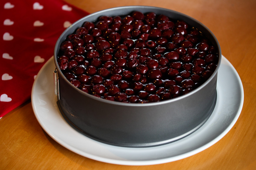 Sett kaken i kjøleskapet i noen timer til slik at kirsebærlokket stivner.