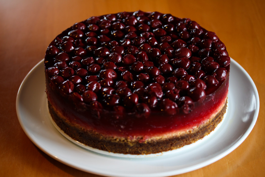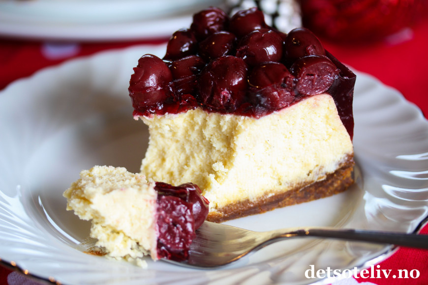 Dekk ostekaken med avrente, hermetiske kirsebær.