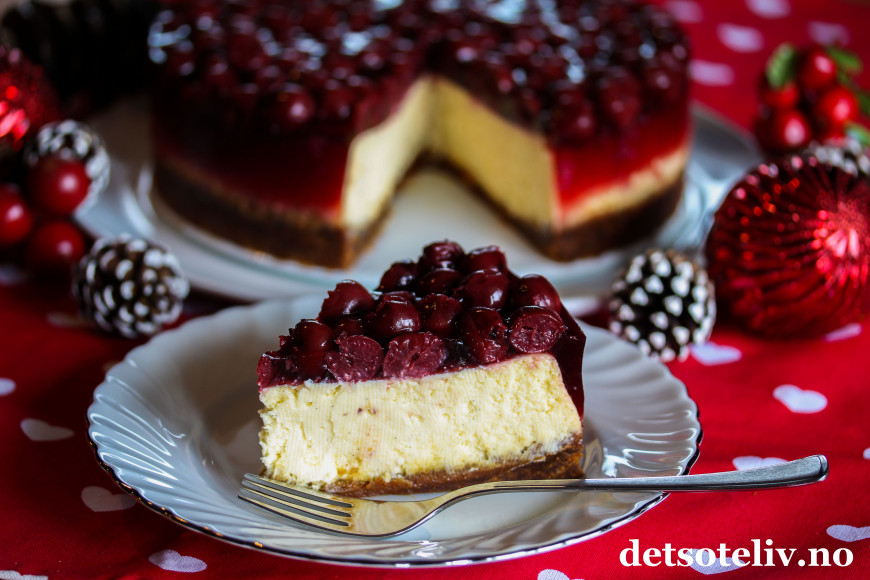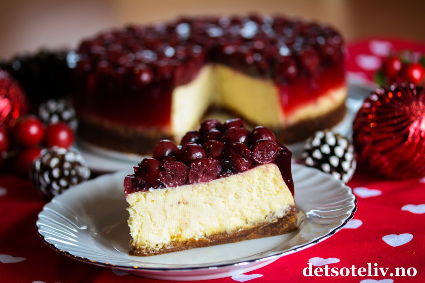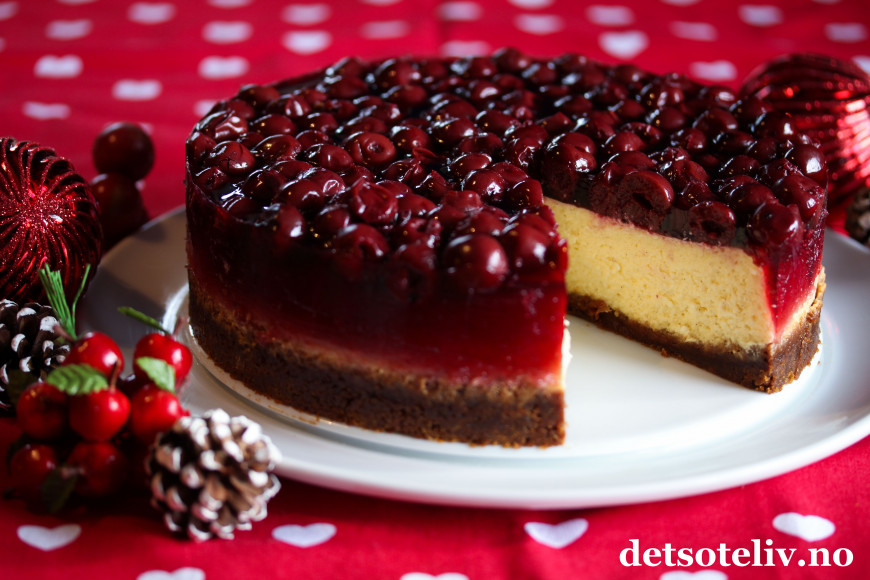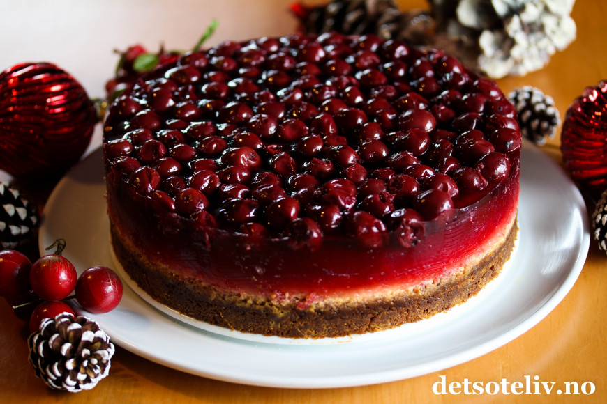 Siden det snart er jul, har jeg her komponert en ostekake med pepperkakebunn og kirsebærlokk, som gir vakker, rød farge på kaken. Ostekaken er kremete i konsistensen og fantastisk på smak!