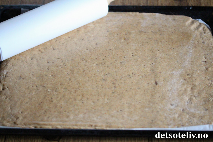 Mens deigen fortsatt er varm, kjevles den utover på en bakepapirdekket stekeplate. Den utkjevlede deigen skal være ca 0,5 cm tykk.