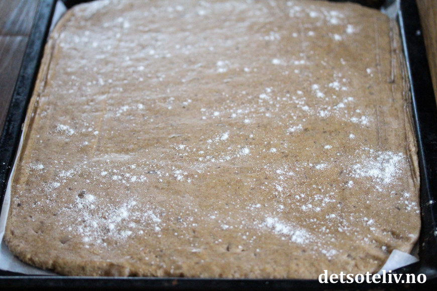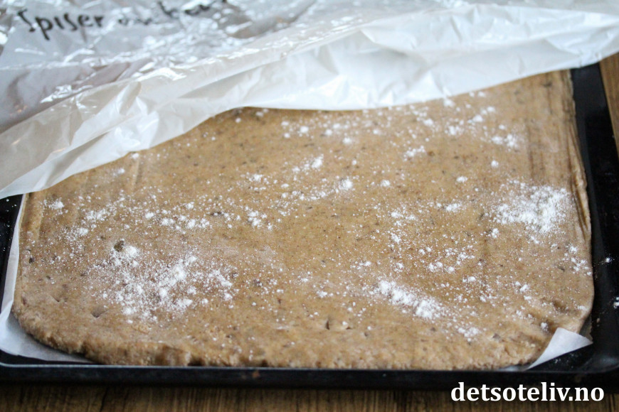 Mens deigen fortsatt er varm, kjevles den utover på en bakepapirdekket stekeplate. Den utkjevlede deigen skal være ca 0,5 cm tykk. La så platen med den utkjevlede deigen stå i romtemperatur i 5-6 timer (eller over natten)!