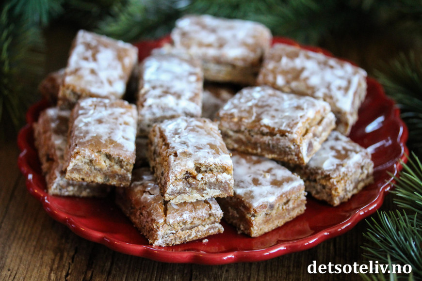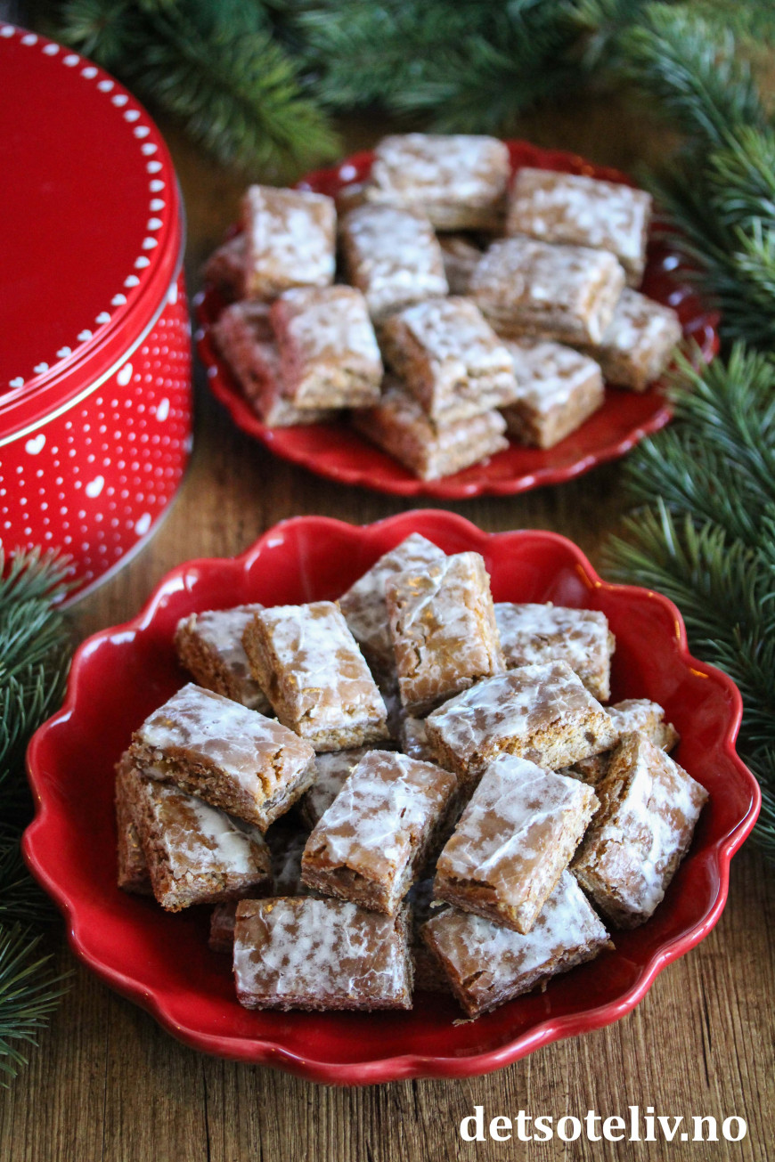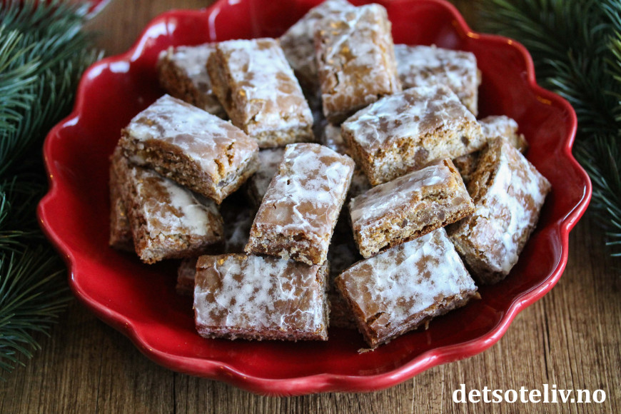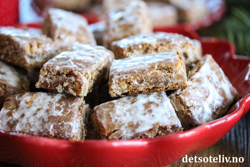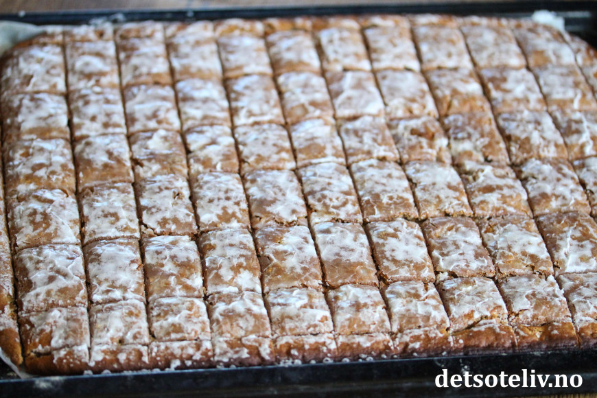Rør imens sammen melisglasuren. Det skal bli en tynn glasur som pensles over den varme kaken straks den kommer ut av ovnen. Skjær kaken opp i rektangulære firkanter (størrelse ca 3x5 cm) med en skarp kniv.