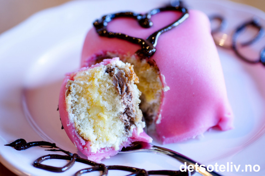 Utrolig godt med vaniljekrem og sjokoladekrem i marsipankaker!