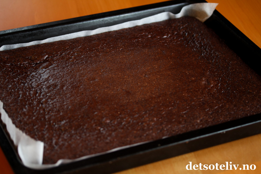 Ha deigen i en stor, bakepapirkledd langpanne (ca. 30x40 cm). Stek kaken midt i ovnen ved 180°C i 25-30 minutter, til kaken er gjennomstekt.