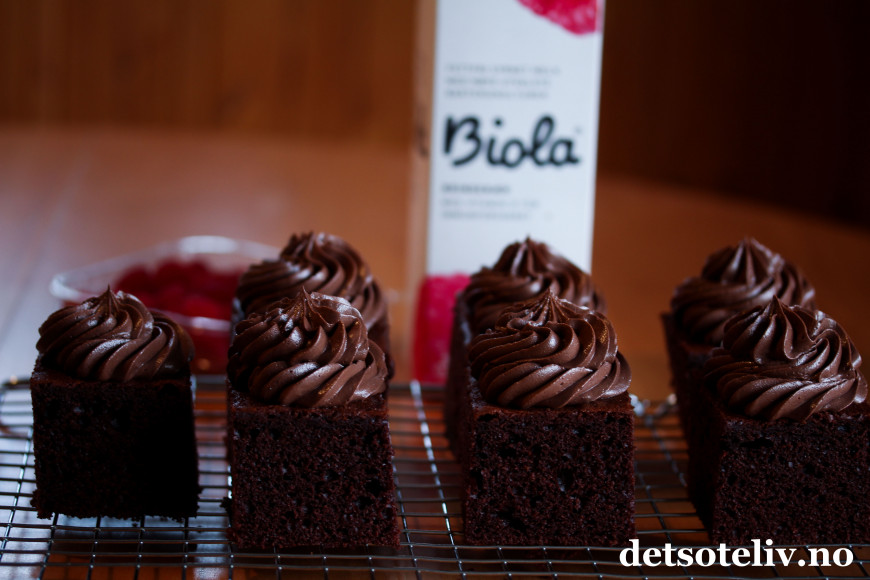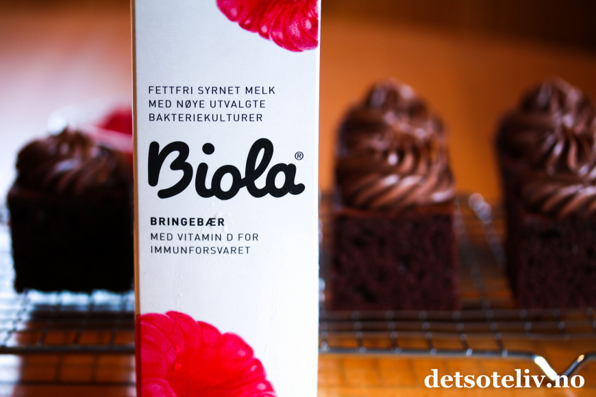 ♥ Biola er en surmelk med gunstige melkesyrebakterier som fås kjøpt i de fleste norske matbutikker. Jeg har brukt Biola med bringebærsmak som setter en veldig mild touch av bringebær på sjokoladekaken. Du kan i stedet bruke Biola med annen smak eller naturell variant, eller du kan bruke Cultura, kulturmelk eller annen type surmelk.