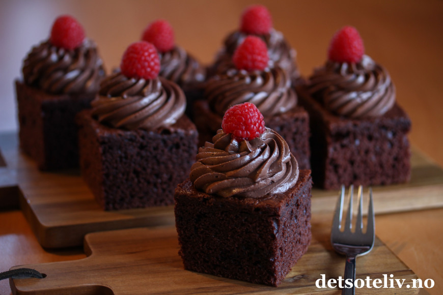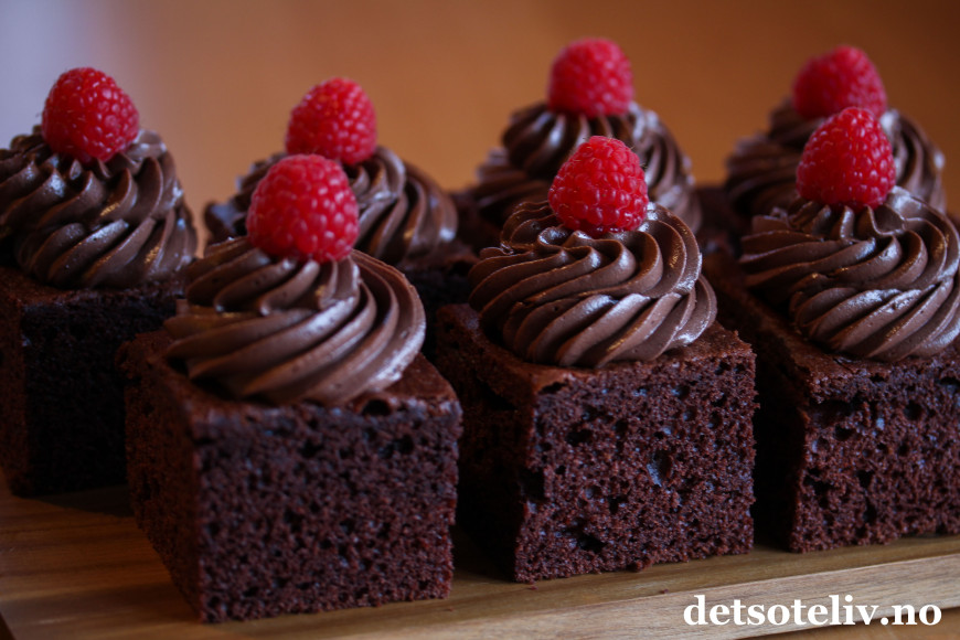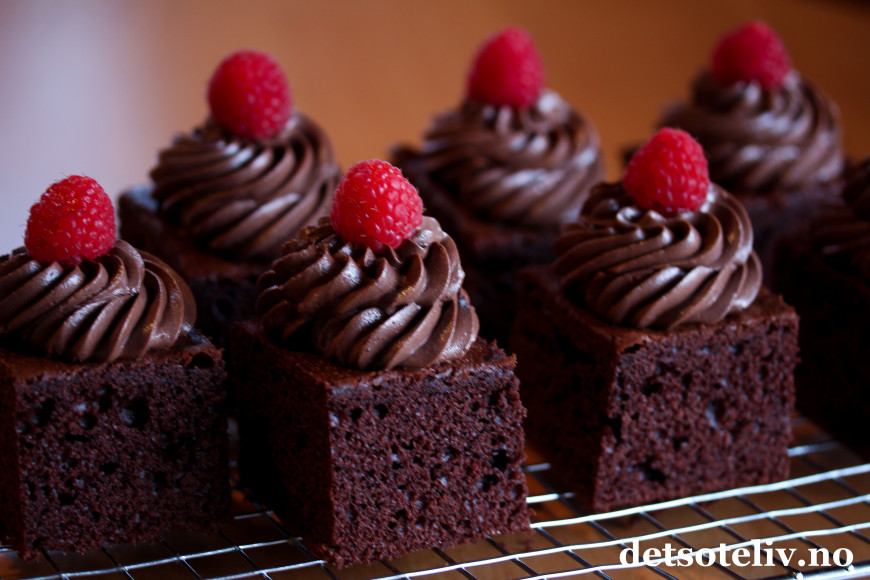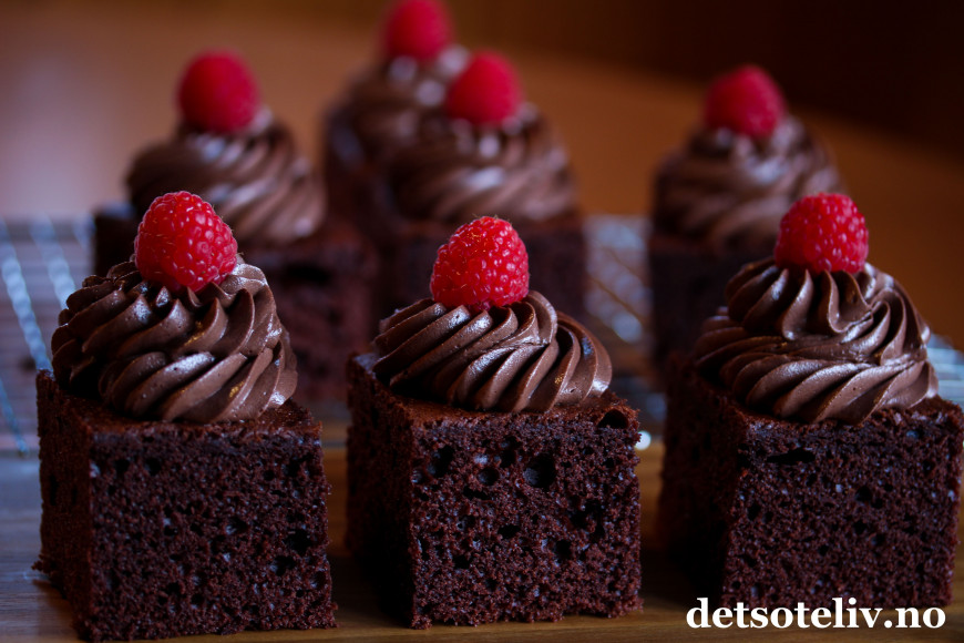 Ha sjokoladekremen i en sprøytepose og sprøyt små rosetter med sjokoladekrem på hvert kakestykke. Pynt med bringebær.