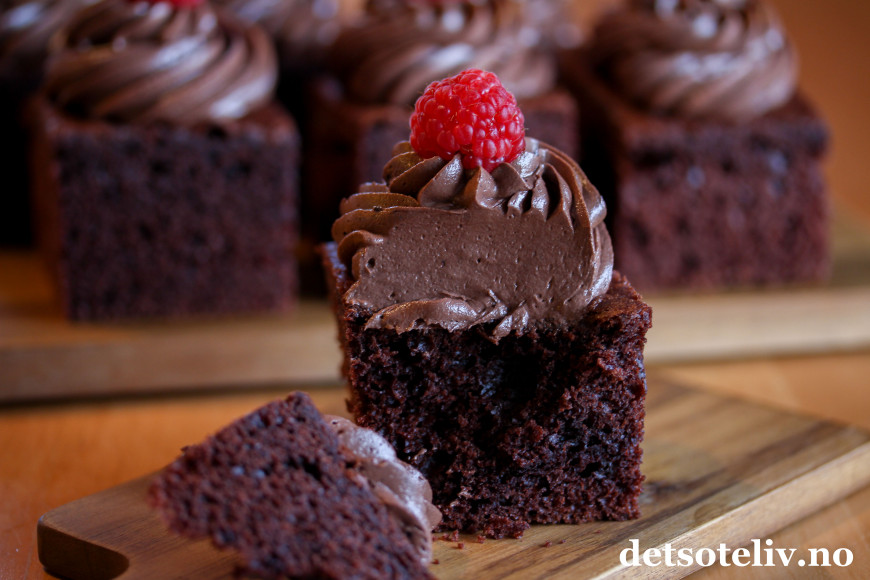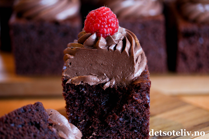 ♥ Jeg har brukt sprøytespissen 1M fra Wilton. Det går så klart like bra å smøre sjokoladekremen jevnt over den avkjølte kaken i stedet for å sprøyte den ut på hvert kakestykke.