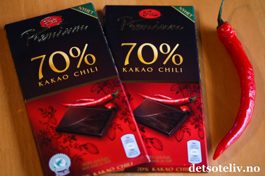 Her har jeg testet å bake med Freia Premium 70% kakao og chili!
