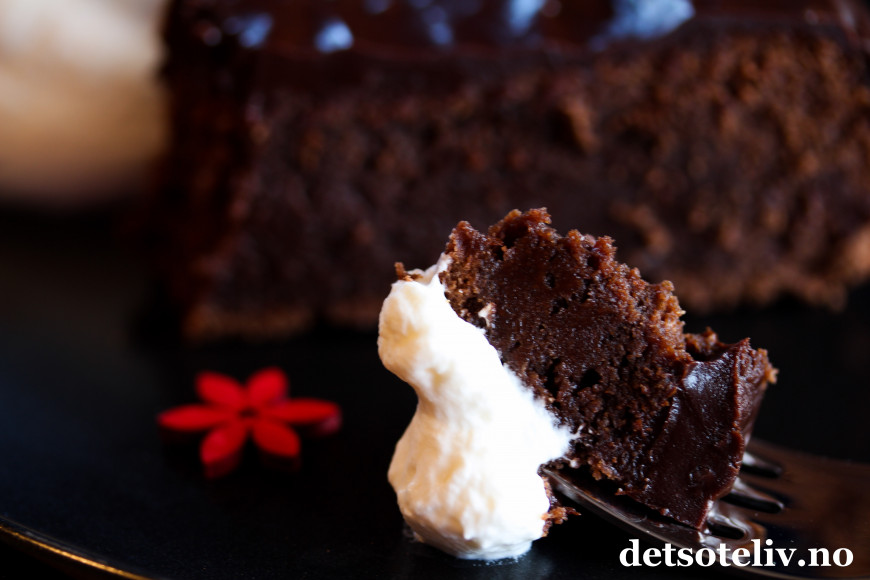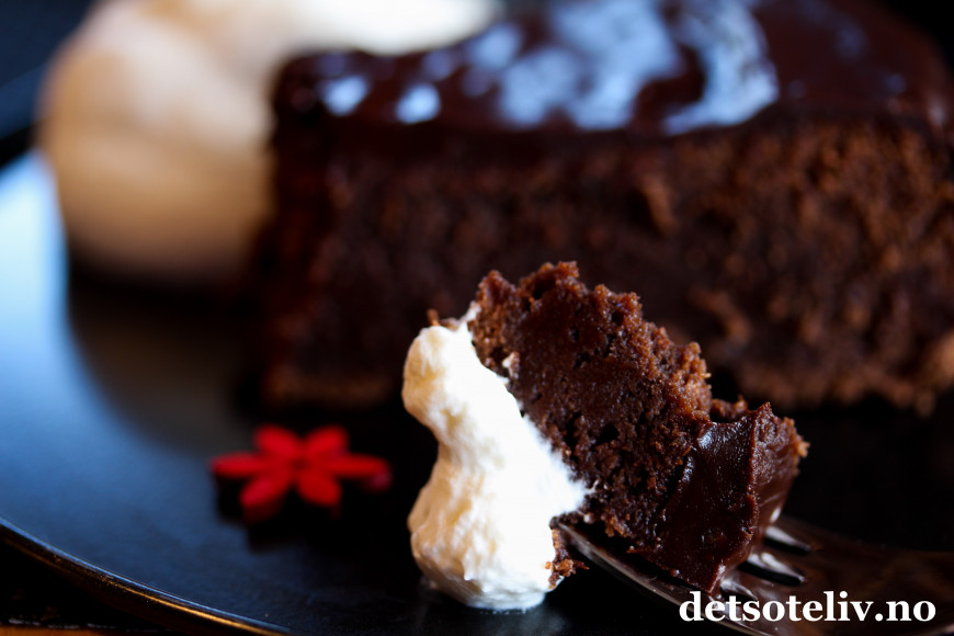 ♥ Vær nøye på å ikke steke kaken lenger enn anvist. Det er viktig for at konfektkaken skal få den bløte kjernen som den skal ha. Kaken skal fortsatt virke fuktig og ustekt i midten når den tas ut av ovnen. Etter at den er avkjølt og har stått en stund i kjøleskapet, vil kaken bli fastere i konsistensen.