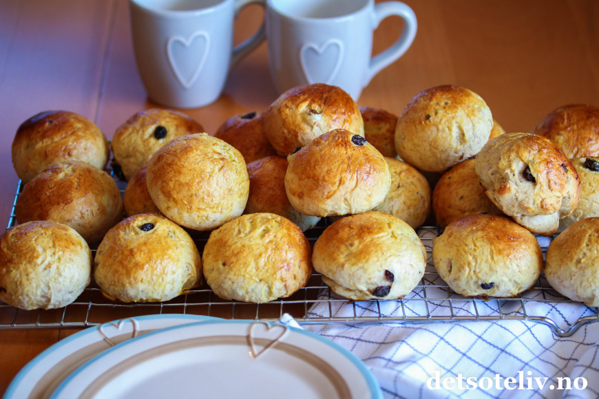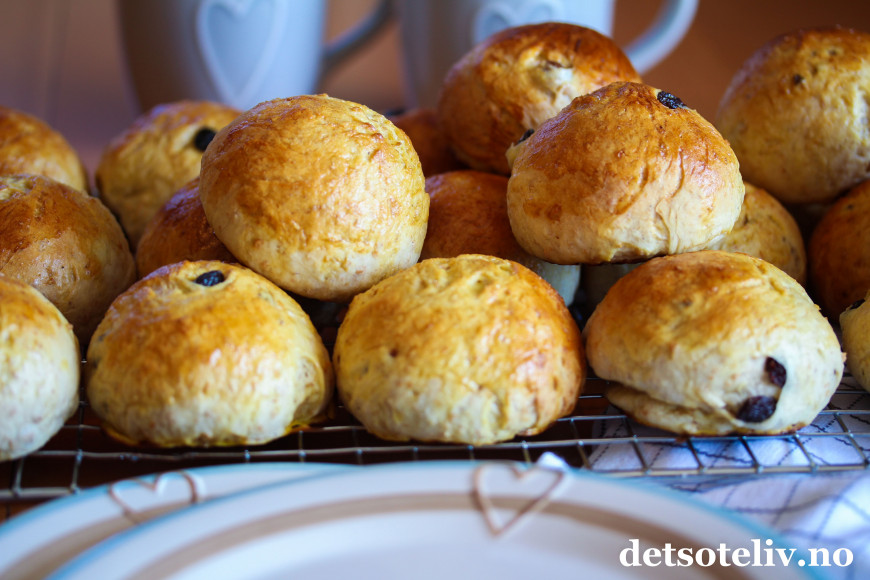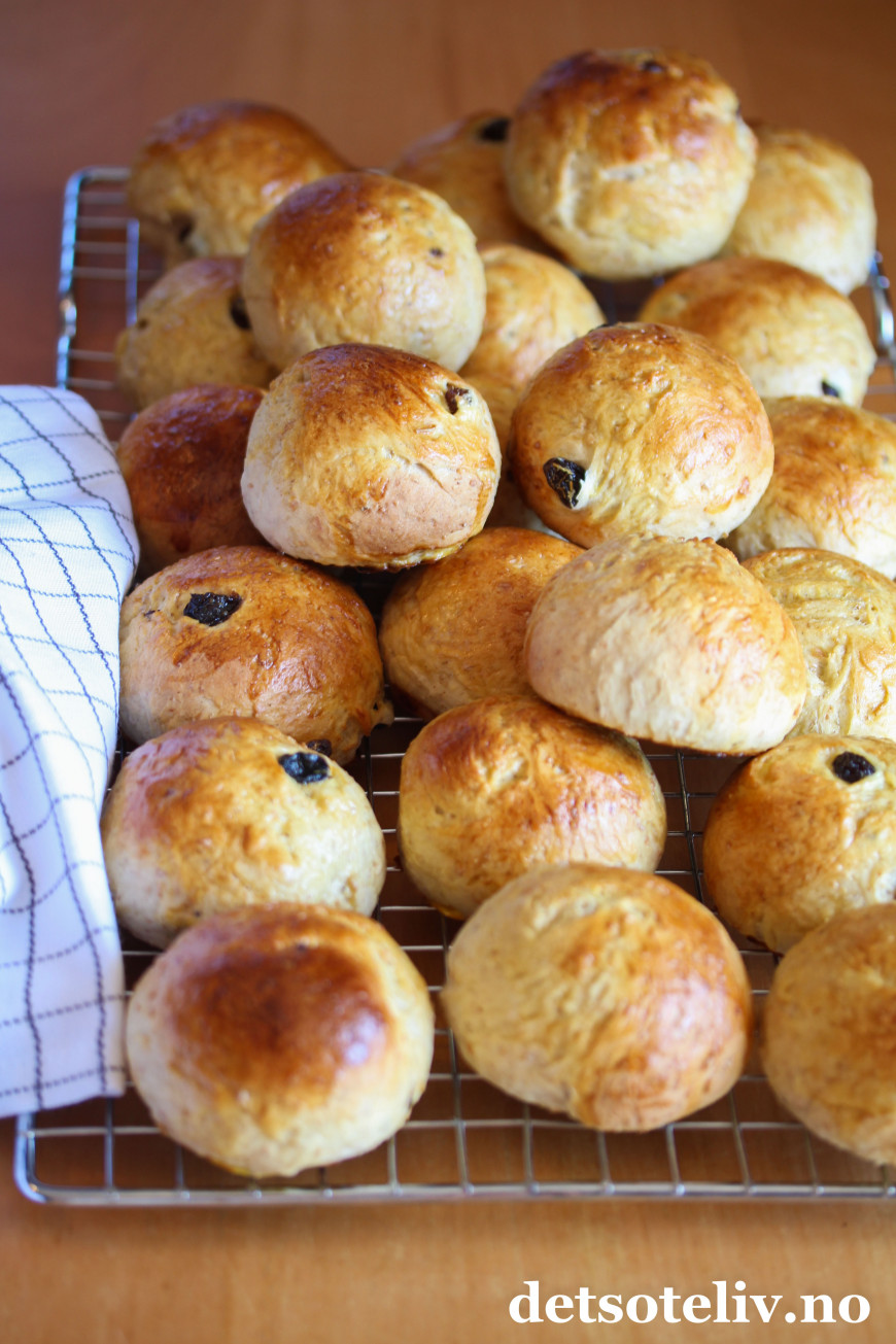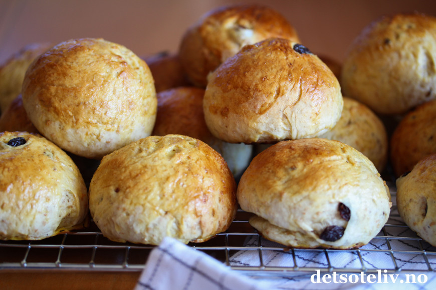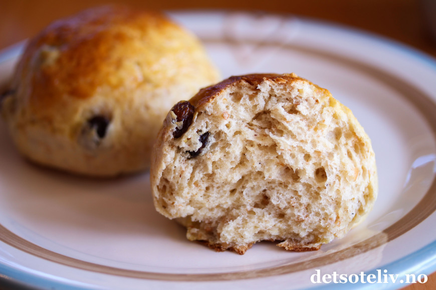 Nydelige rosinboller med akkurat passe mye grovt mel til at de fortsatt er veldig myke og gode!