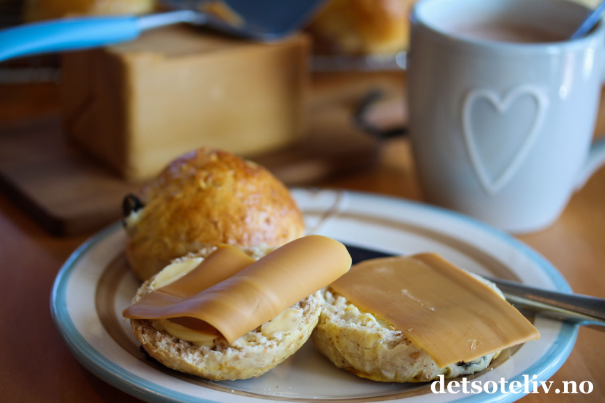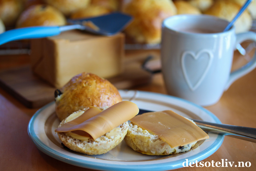 Grove rosinboller er gode som de er, men prøv dem med smør og brunost og en kopp varm kakao ved siden av...