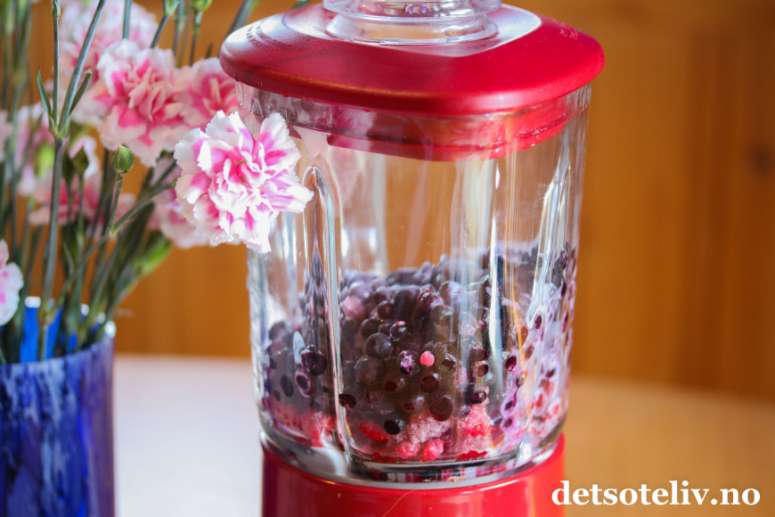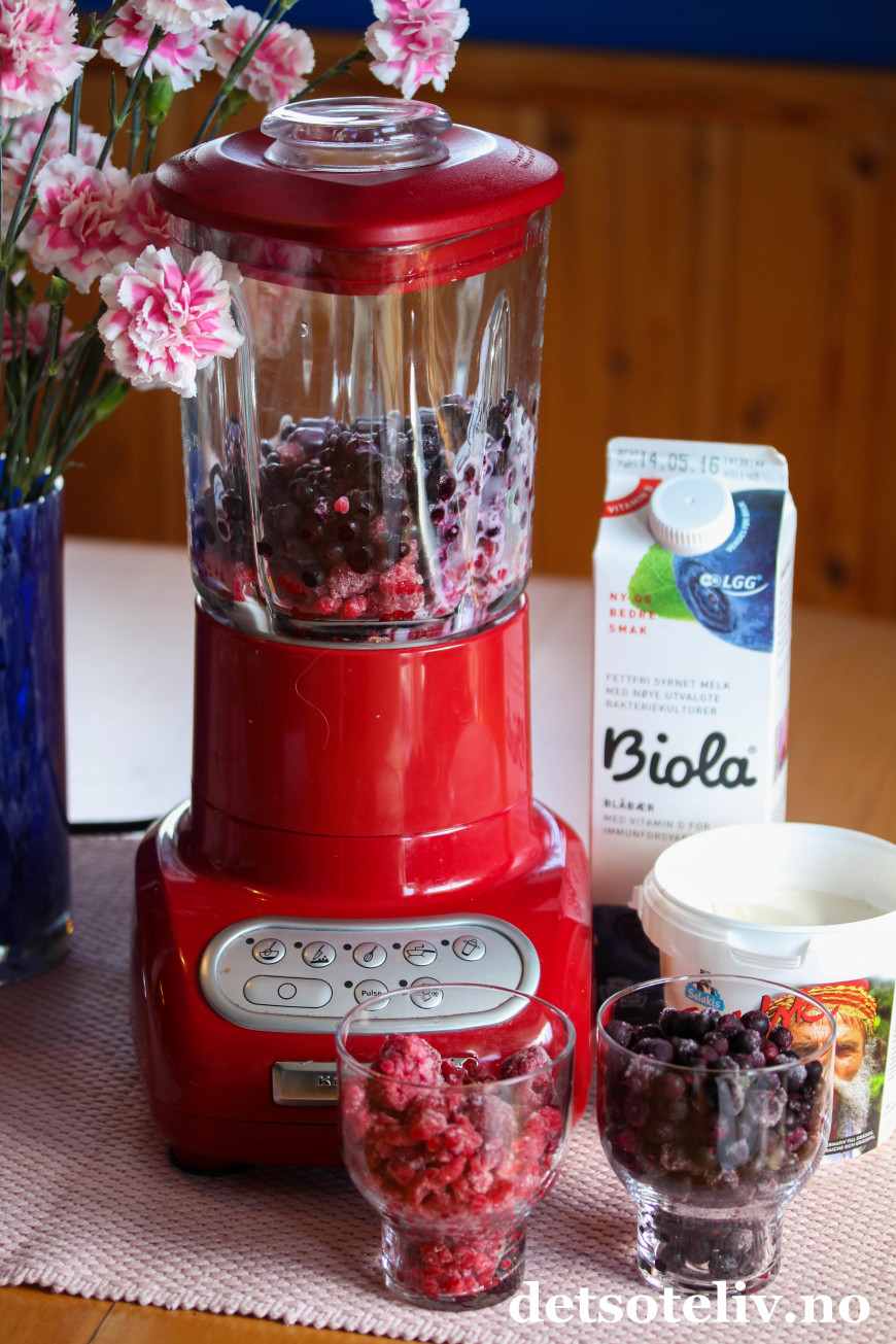♥ Det fine med blåbær og bringebær er at de er nokså små og derfor lar seg knuse nokså lett i en blender selv om de er frosne (dette i motsetning til for eksempel jordbær som ofte kan bli store og harde klumper, som derfor må tines litt før de lar seg knuse). Ta nok Biola og yoghurt til at bærene lar seg knuse i blenderen, og rør rundt av og til hvis noen frosne bær setter seg fast i knivbladene i blenderen.