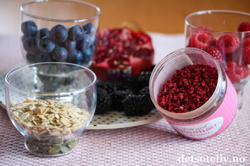 Her viser jeg deg først hvordan jeg lager en veldig populær variant, som jeg synes er kjempegod! Den består av frosne bringebær og blåbær, Biola (syrnet melk) med blåbærsmak og gresk yoghurt. På toppen strør jeg friske bær, granateplekjerner, gresskarkjerner, havregryn og tørkede bringebær.