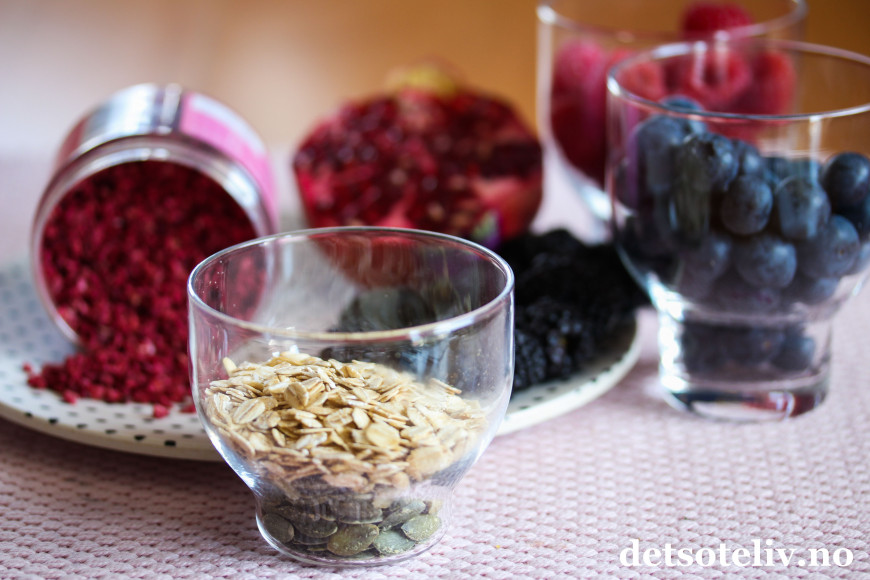 På toppen kan man drysse bær, nøtter, frø, tørket frukt, havregryn, granola +++, enten i et dekorativt mønster, eller vilkårlig slik jeg har gjort her.
