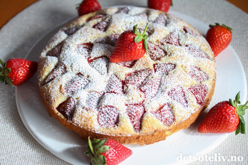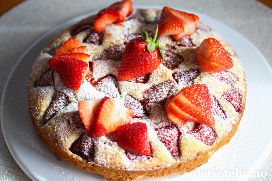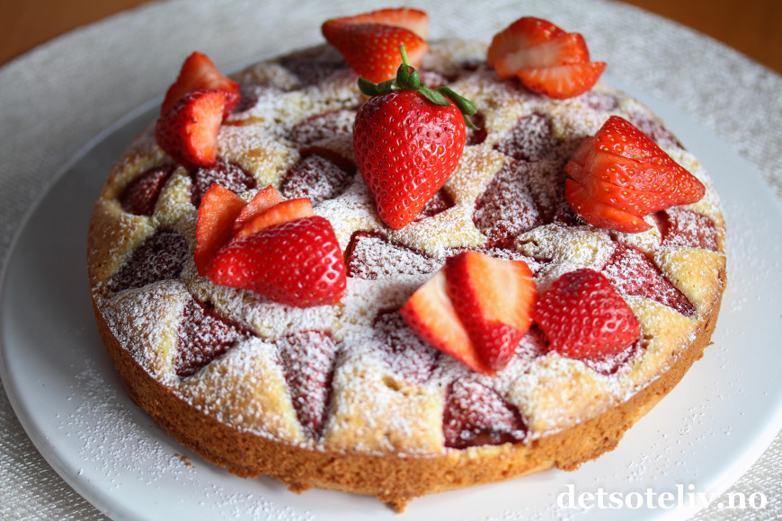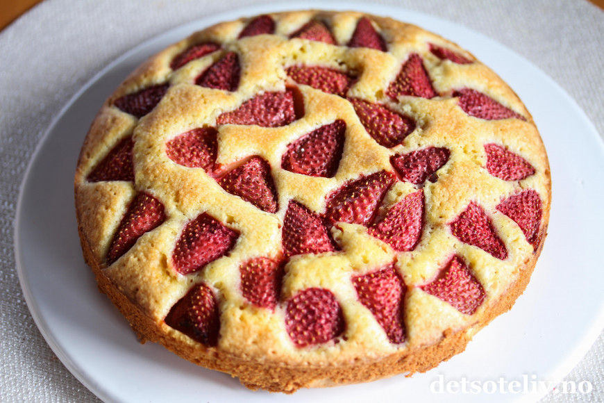 Hell deigen i en rund form (24 cm i diameter) med bakepapir i bunnen. Del jordbærene på midten og legg dem ned i deigen.