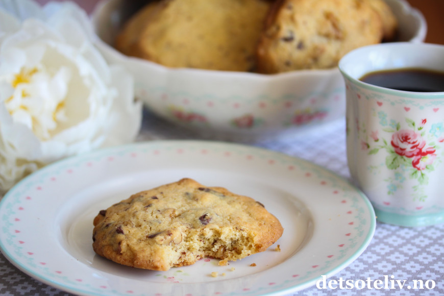 At cookiesene måtte inneholde sjokoladebiter var selvsagt, men hun var litt skeptisk da jeg foreslo valnøtter (min favorittkombinasjon). Men da hun fikk smake på en nystekt kake, fikk jeg godkjenning av det overbevisende slaget...