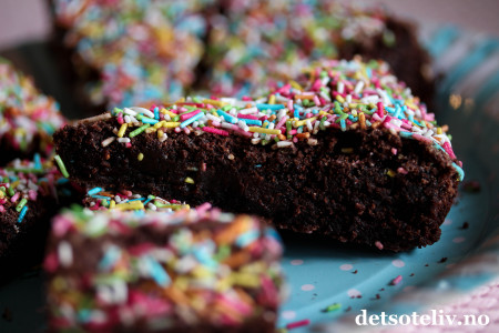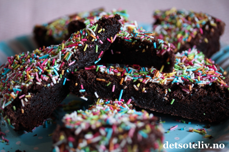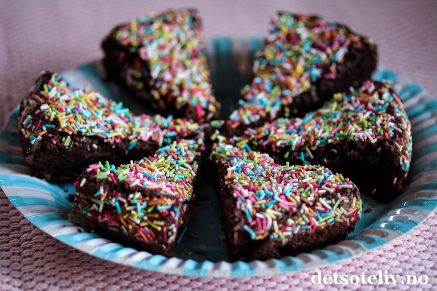 Denne kladdkaken er så lett å lage at barna gjerne kan være med på å lage den også. Datteren min rørte sammen denne kakedeigen uten problemer, og hun syntes det var ekstra morsomt å drysse det fargerike kakestrøsselet på toppen.