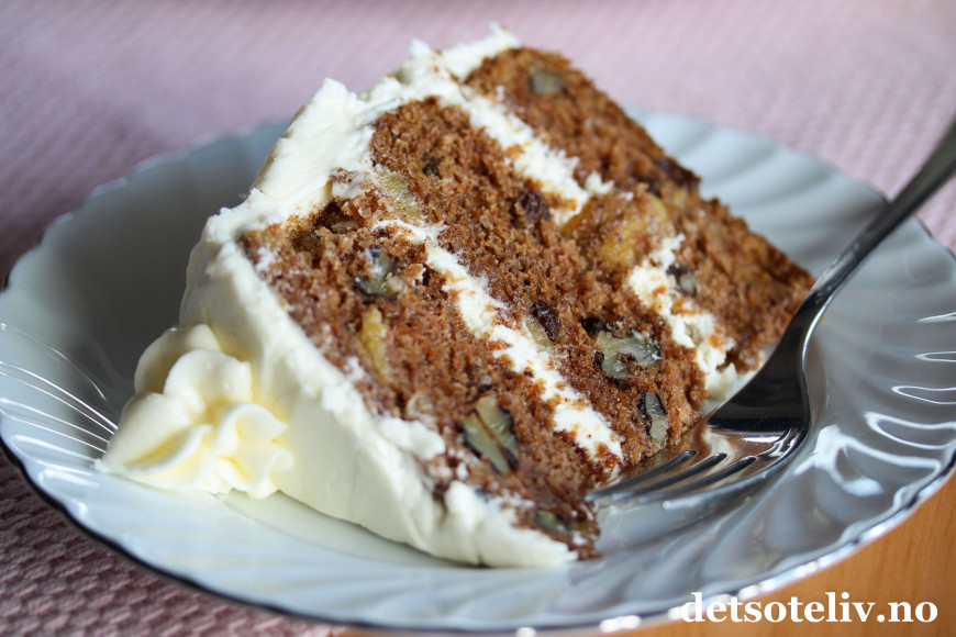 Dette er en myk og amerikansk-inspirert gulrotkake med kanel, brunt sukker, rosiner, valnøtter og ananasbiter. Kaken blir veldig saftig og kjempegod på smak - og dessuten blir den høy og flott å se på og passer dermed utmerket til festlige lag!