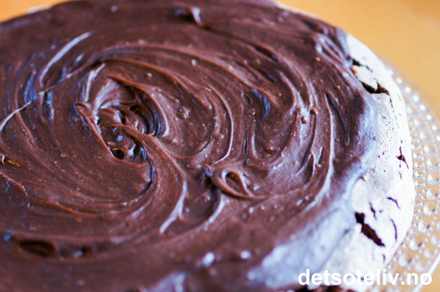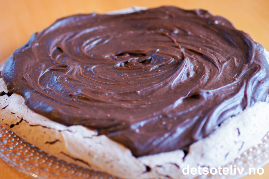 ♥ Det er viktig at sjokoladekremen får stå i kjøleskapet til den får tykk nok konsistens, ellers vil den bare flyte utover kaken. Jeg tror jeg lot den stå i kjøleskapet i minst et par timer. Rør i kremen av og til for å sjekke konsistensen. Kremen må ikke bli altfor tykk heller, for da blir den vanskelig å fordele over marengsbunnen.