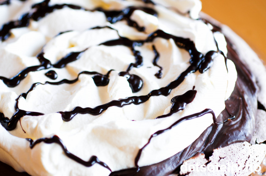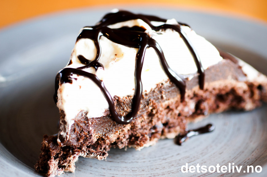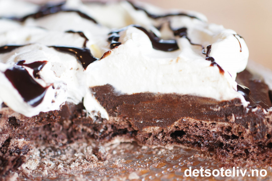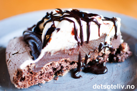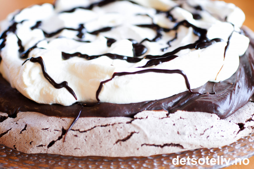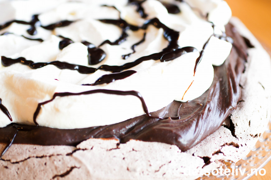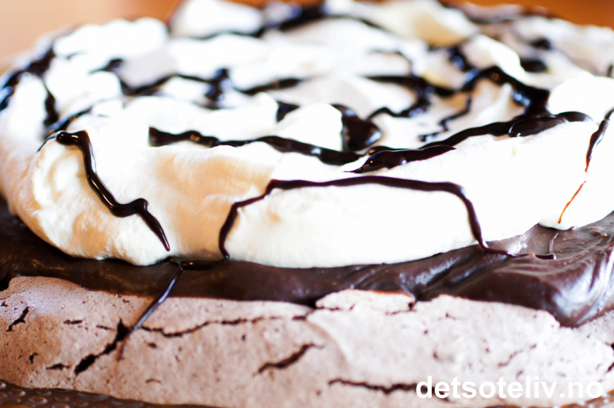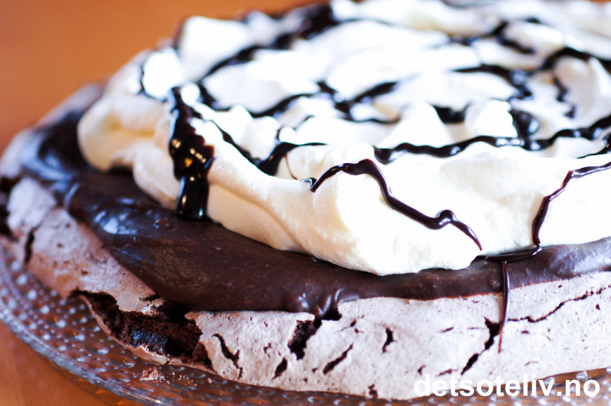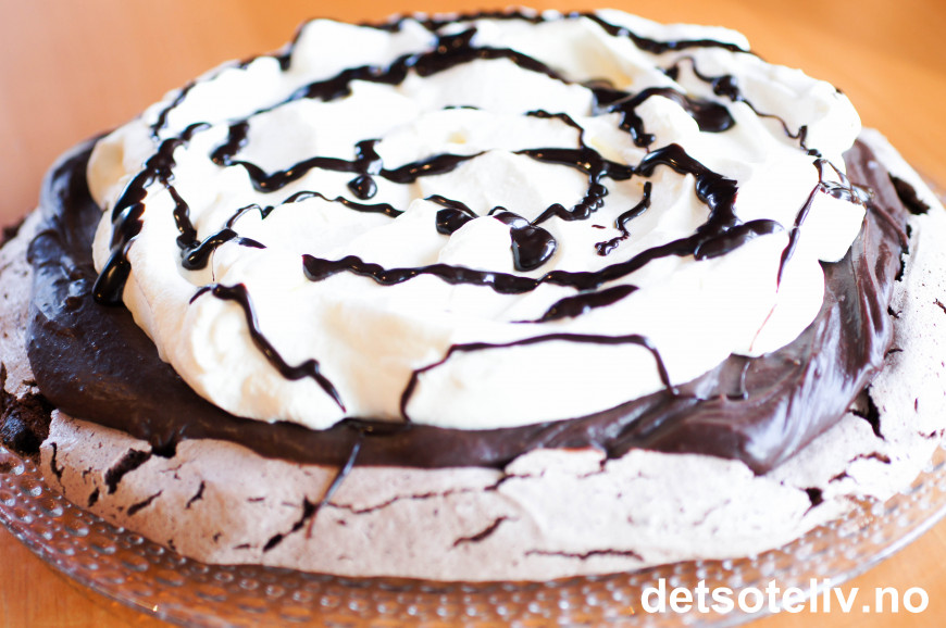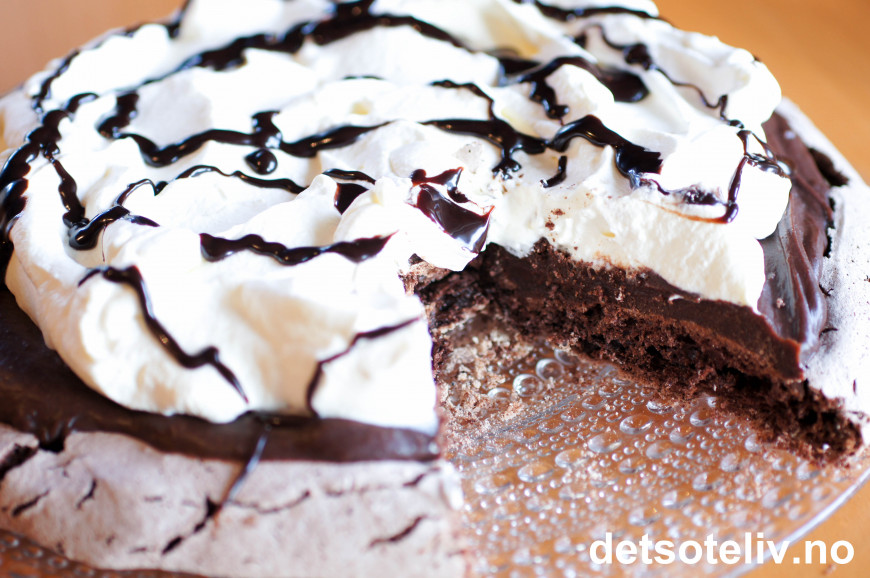 Dette er en sjokolademarengskake som dekkes av en sinnsykt god sjokoladekrem og oppå der igjen pisket krem og sjokoladesaus.