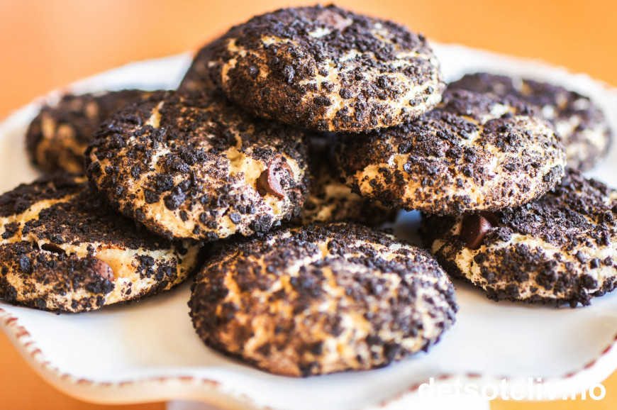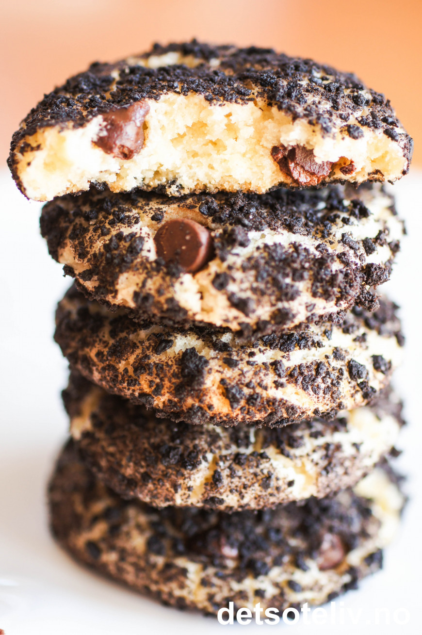 Deigen trilles til kuler som deretter rulles i Oreokjekssmuler. Under steking sprekker overflaten opp og gir kjempekul utseende på cookiesene.