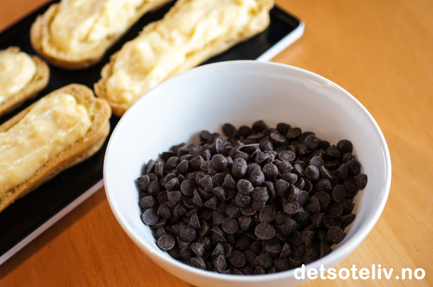 ♥ For å få fine Éclairs, bør du helst sprøyte vannbakkelsdeigen ut med sprøytepose og bruke stor sprøytetipp. Det får du kjøpt i flere nettbutikker som selger kakepynteutstyr, blant annet hos Kakebua, se her.