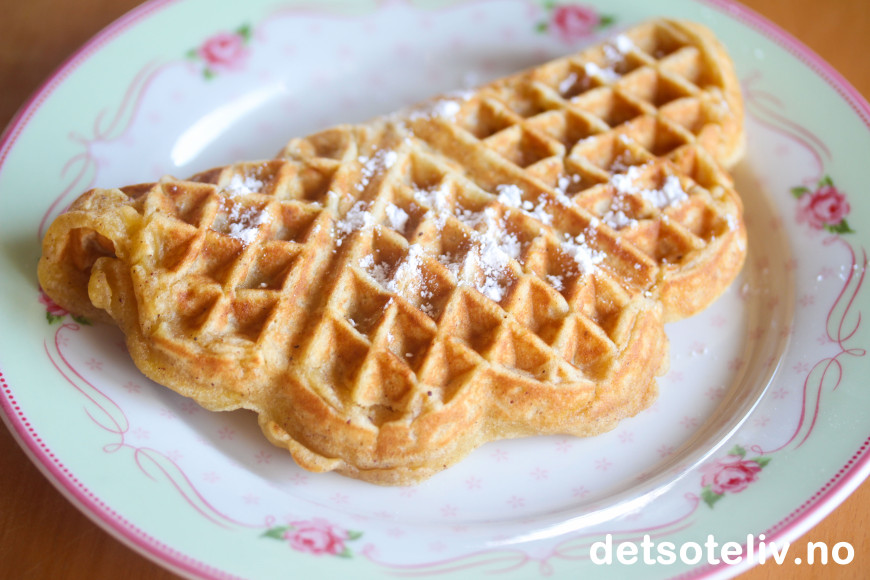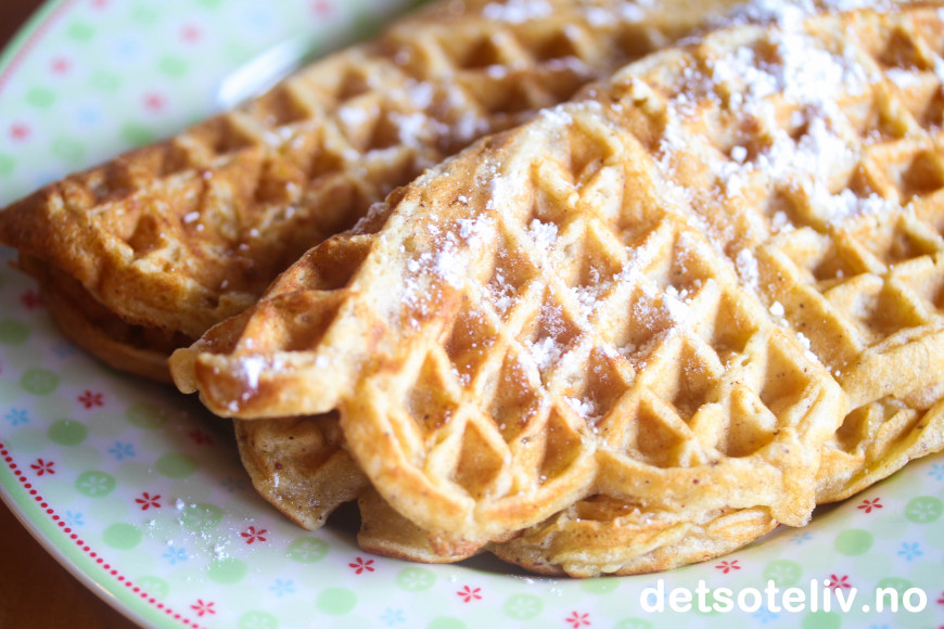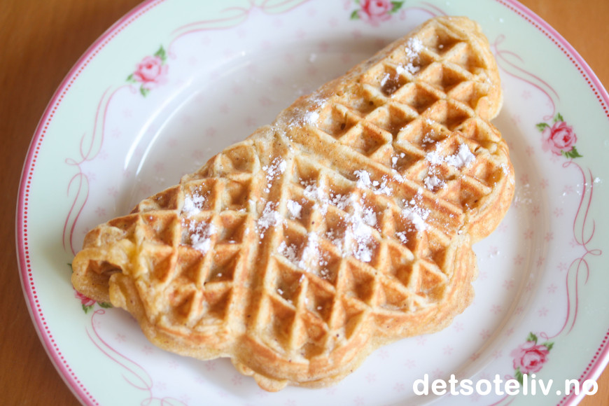 Gode vafler ble det. Sløyfet eple og kanel da. Hadde i 1 ts natron rett før steking.