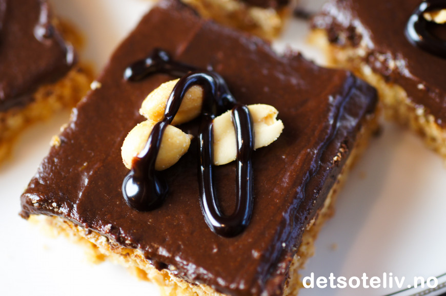 Smør glasuren over kaken og del kaken opp i firkanter. Pynt gjerne med peanøtter og smeltet sjokolade.
