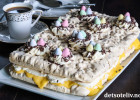 Ha deigen i en stor, bakepapirkledd langpanne (ca 30X40 cm). Stek kaken midt i ovnen ved 175°C i ca 40 min. Avkjøl kaken i formen. Hvelv kaken ut av formen og fjern bakepapiret.