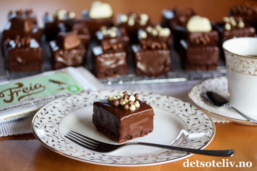 Disse sjokoladebrowniesene lages med skikkelig god og mørk kokesjokolade fra Freia som gir konfektaktig konsistens og deilig smak, og i tillegg dyppes kakene i smeltet Freia kokesjokolade.